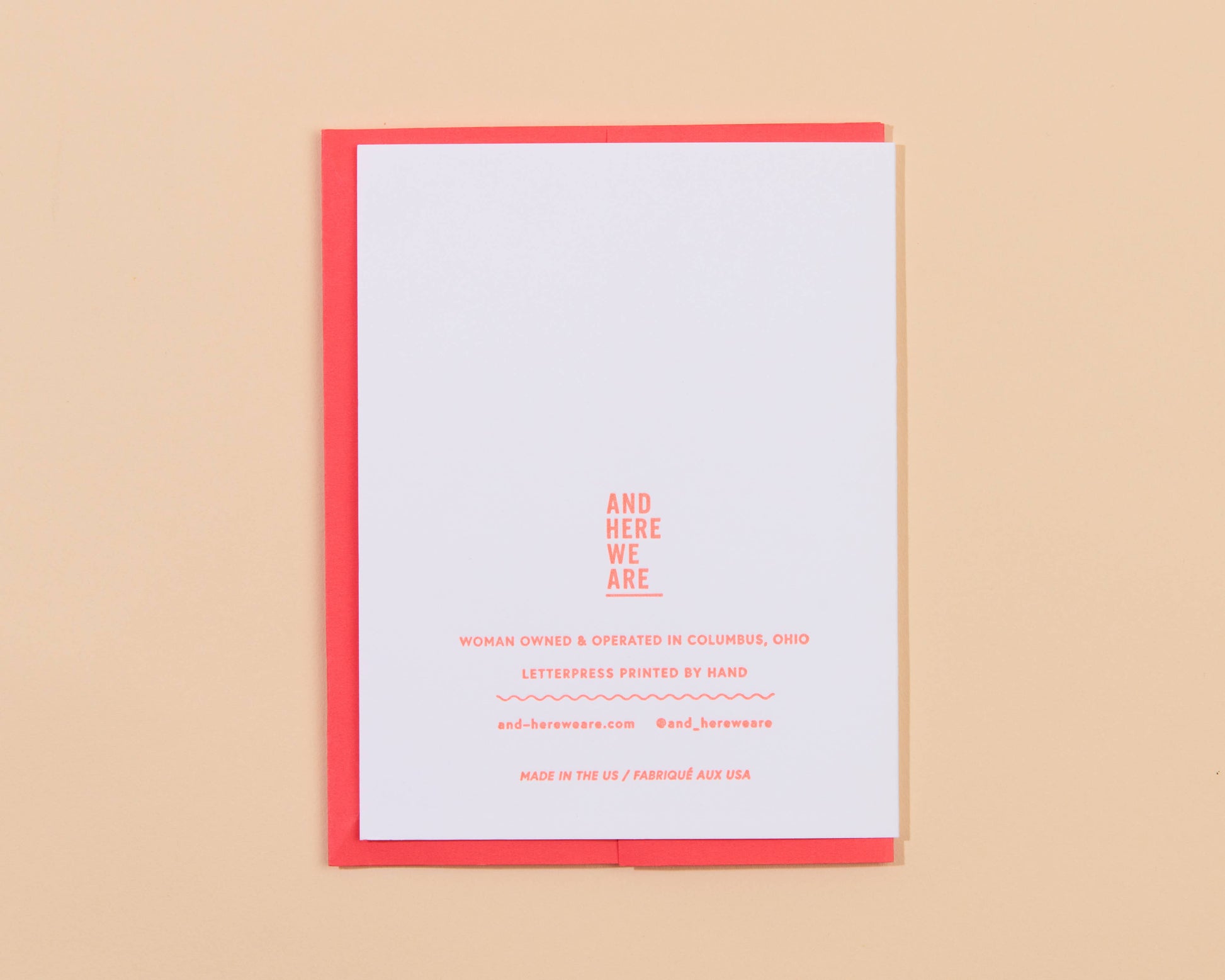 Hand printed in Columbus, Ohio, this card is created with vibrant neon inks that give it a bold, cheerful finish. Each card comes with a coordinating envelope, ready for gifting.