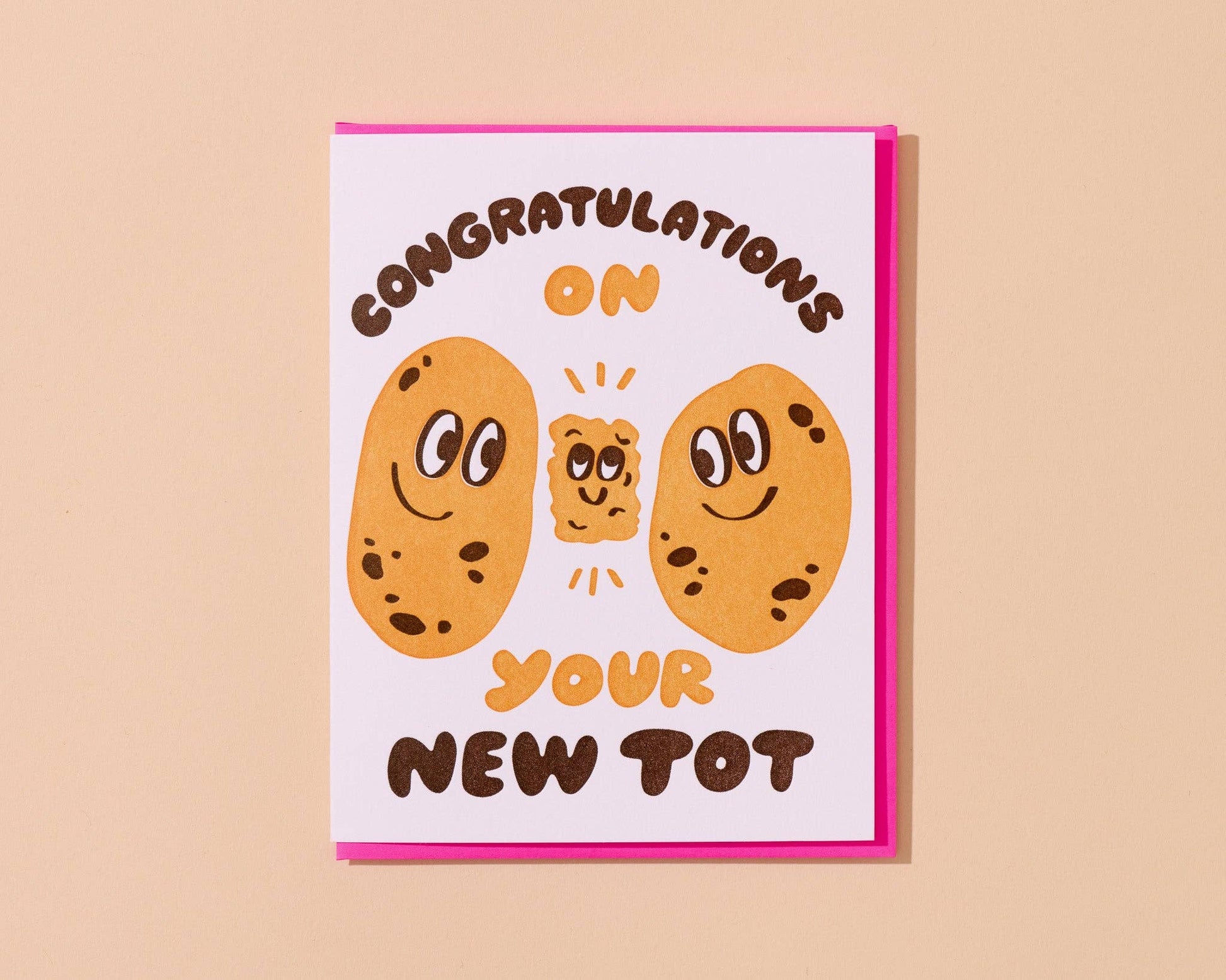 A perfectly a-peeling way to welcome a new arrival! This charming letterpress card features two proud potato parents and their adorable tater tot baby — a heartwarming and gender-neutral way to celebrate new beginnings. Ideal for baby showers, new parents, or any growing family that appreciates a touch of humor and hand-printed charm.